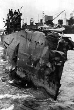 Uh, oh, this boat of the 9th. flotilla had an unfriendly encounter with a sinking merchant ship during a periscope attack. Only some centimeters more and that boat would stay submerged for ever somewhere out in the the atlantic. The damages of the outer hull and the tower luck very impressive, but the inner hull did not take too much damage. |