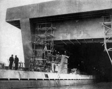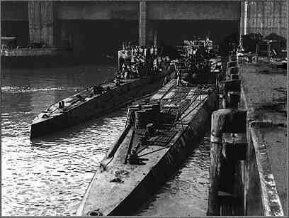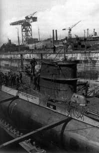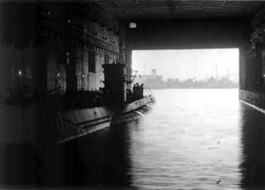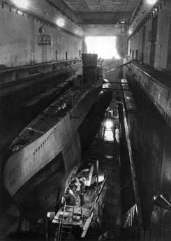 With only a few pens operational, the u-boat is taken in an open dry-dock to get the hull and the tower repaired. |