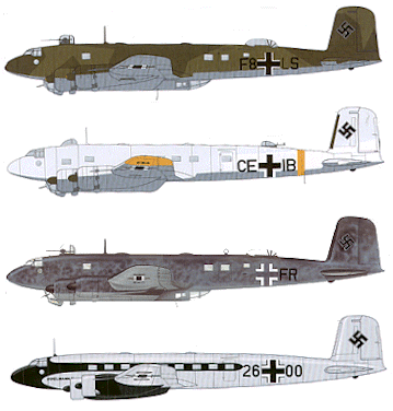 200 Condor was a master-piece of improvisation The plane was constructed as an airliner for non-stop flights between Berlin and New York and had a greater range as all other german bomber types. The KG 40 was equipped with Fw 200 to attack convoys. In far-range operations from the french coast to Norway and in co-operation with the U-boats the plane was a very effictive weapon. From August 1940 until Februar 1941 85 ships with 363.000 BRT were sunk by Fw 200. The disadvantage of the plane was it's primary construction as an airliner which lead to some hull-breaks at the landing. As the british began to secure their convoys with fighters the Fw 200 became an easy prey which lead to a re-direction for cargo-purposes in 1944.