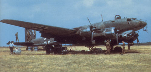 200 Condor was a master-piece of improvisation The plane was constructed as an airliner for non-stop flights between Berlin and New York and had a greater range as all other german bomber types. The KG 40 was equipped with Fw 200 to attack convoys. In far-range operations from the french coast to Norway and in co-operation with the U-boats the plane was a very effictive weapon. From August 1940 until Februar 1941 85 ships with 363.000 BRT were sunk by Fw 200. The disadvantage of the plane was it's primary construction as an airliner which lead to some hull-breaks at the landing. As the british began to secure their convoys with fighters the Fw 200 became an easy prey which lead to a re-direction for cargo-purposes in 1944.